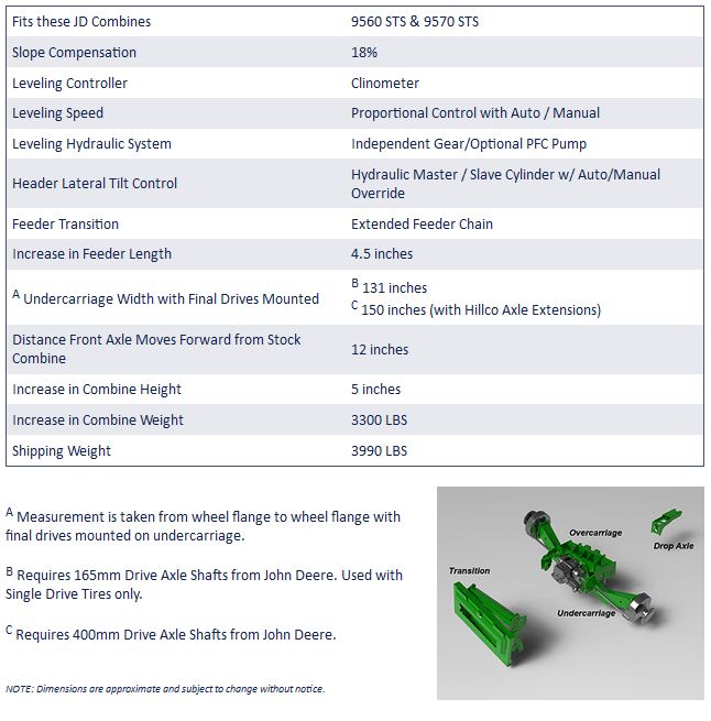 To compensate for the height increase the overcarriage/undercarriage adds to the combine chassis it is necessary to increase the height of the back of the combine. The function of the drop axle assembly is to balance the combine fore/aft. This bolt-on component is located between the combine`s main frame and rear axle. After installation of the Hillco Leveling System the combine will be slightly shorter than a John Deere Sidehill combine. The Hillco Sidehill model raises the combine 5 inches to achieve maximum leveling.