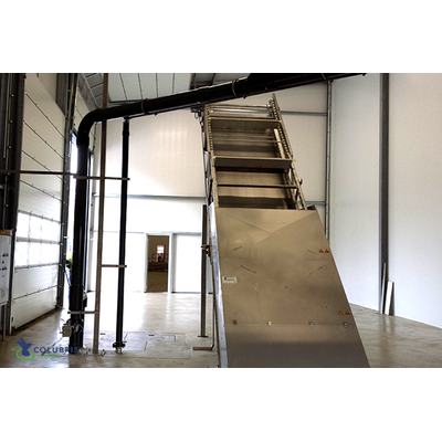 The waste is slowly fed upwards through the sieve conveyor. Most of the adhering water is removed. The waste is raised suficiently high to be immediaely disposed of in a container(s).