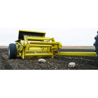 The hitch pole, considerable longer than typical rock pickers, is allowed to pivot, providing a large working envelope, superb visibility for picking rocks and the ability to tuck the picker behind the tractor for narrow transport. By simply pulling a pin, the machine is readied for field or transport. For more demanding operators, a hydraulic option is available and recommended for overall ease of use and extremely handy to precisely back up to rock piles.