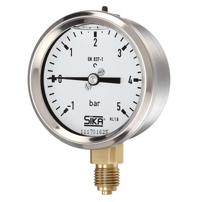 SIKA quality pressure gauges in industrial version with 100, 160 or 250 mm stainless steel casing are suitable for pressure measurement of gaseous and liquid media, but not for highly viscous or crystallising media. DIN display ranges available from -1...0 bar up to 0...1,600 bar (up to...1,000 bar, brass connection; up to...1,600 bar with stainless steel connection). We manufacture special ranges on request. The stainless steel casing is available either as a bayonet ring case (type MRE) or as a cramped-on ring case (type MRE-G).
