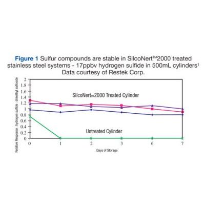 SilcoNert 2000 surface treatment eliminates surface adsorption of active compounds on steel, glass, ceramic and carbon surfaces. Sulfur Compound Storage in SilcoNert 2000 Treated vs. Untreated Sample Cylinders Figure 1 depicts performance results from a comparison in which a gas containing 17ppbv of hydrogen sulfide was stored for 7 days in untreated and in SilcoNert 2000 treated stainless steel high pressure sample cylinders. The results show a SilcoNert 2000 treated sampling system will reliably store low levels of this active sulfur-containing compound in process streams for long periods of time. In contrast, hydrogen sulfide degraded rapidly in the untreated cylinder, and was totally adsorbed within 24 hours.