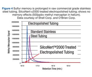 The “memory” of adsorbed active compounds can cause long delays in equilibrating a sample stream. Figure 4 demonstrates the memory effects of the three types of tubing used to transfer streams containing sulfur compounds. The SilcoNert 2000 treated tubing shows less retention of sulfur compounds by several orders of magnitude, indicating very high inertness.