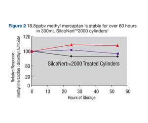 Figure 2 summarizes the results of a similar study in which gas containing 18.8 ppbv methyl mercaptan was stored for 60 hours in SilcoNert 2000 treated sample cylinders. Again, recovery of the active sulfur gas was accurate at the low ppbv concentration, confirming that the sample was stored in contact with an inert surface.