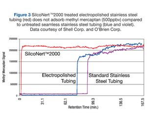 Adsorption of Sulfur Compounds to Tubing Surfaces under sample transfer conditions Comparison of the transport properties of SilcoNert 2000 treated electropolished stainless steel tubing, and raw commercial grade stainless steel tubing show only SilcoNert 2000 treated electropolished stainless steel has the inertness necessary to transfer sulfur compounds at low ppmv to low ppbv concentrations in sample streams. Figure 3 demonstrates uptake of the sulfur compound by the three surfaces. The performance of the SilcoNert 2000 treated, electropolished surface is quite dramatic in comparison to that of untreated electropolished tubing. SilcoNert 2000 treated electropolished tubing did not adsorb methyl mercaptan to any measurable extent, delivering a representative sample with no delay. The untreated electropolished tubing, in contrast, totally adsorbed methyl mercaptan for more than 75 minutes, and the sulfur gas level did not stabilize until approximately 130 minutes. Conventional 316L seamless tubing totally adsorbed methyl mercaptan for more than 90 minutes, and the sulfur gas level did not stabilize until approximately 140 minutes.