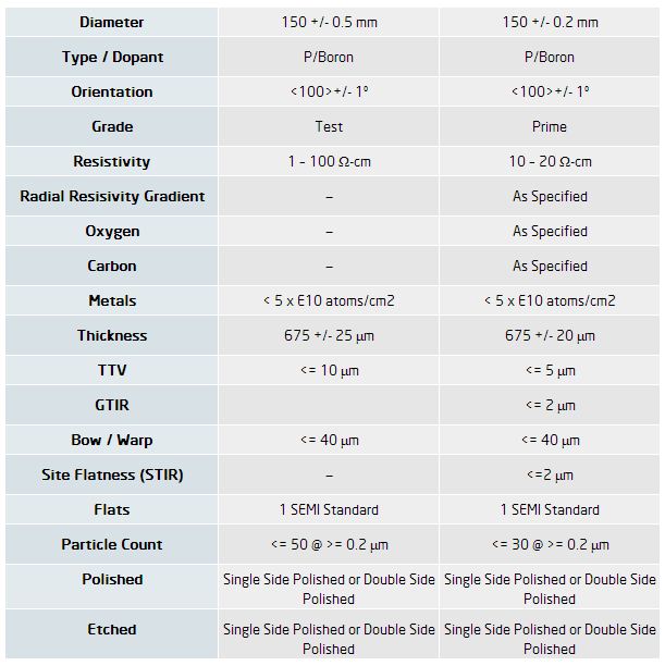 SVM carries a full line of 150mm wafers. Please see below a SEMI standard specification for prime and test grade wafers. Every customer’s specification is unique and SVM can supply wafers that meet your exact specifications.