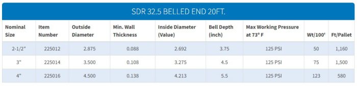 SDR 32.5 - Standard Compliances: ASTM D-2241, standard for pressure pipe.