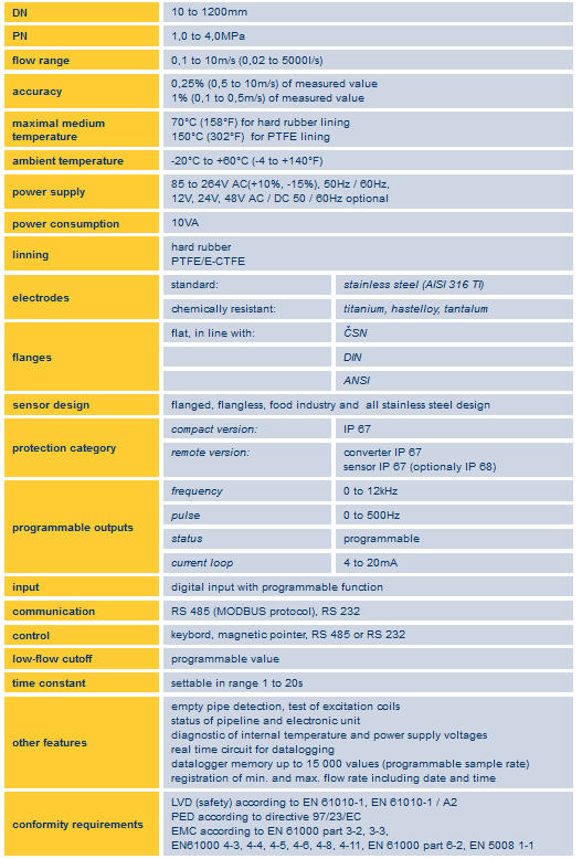 Time and temperature bi-directional measurement stability. Internal cpu (able of corrections in case of low flow rate etc.). Autodiagnostics of electronic unit and pipeline. Datalogger memory up to 15 000 values (programmable sample rate). Data recovery in case of loss of data (due to high level electrostatic discharge etc.). Detection of empty pipe. Option of setting low flow rate bandwidth. Dead zone setting. Diagnostic of internal temperature. Rs 232 and rs 485 (modbus protocol) communication outputs. Compact / remote version.
