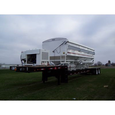 24 ton trailer mounted side delivery tender (shown with optional self-contained engine drive and fold down catwalks). The Simonsen BFT8024STR side discharge tender is a 3 compartment tender and has many available options including 6" higher sides, splits for 1 or more compartments, folding catwalks, choice of tarps, wet kit or self-contained drive system, and trailer length. Make this tender your own by choosing the options that customize it for your business.