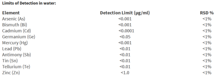The AF400 Simultaneous Double Beam Atomic Fluorescence Spectrometer provides elemental analysis for sub trace detection of hydride-forming elements. The design and functionality provides enhanced sensitivities and reduced interferences for parts per trillion (ppt) detection of Mercury (Hg), Arsenic (As), Cadmium (Cd), Zinc (Zn), Bismuth (Bi), Selenium (Se), Tellurium (Te), Antimony (Sb), Tin (Sn), Germanium (Ge), and Lead (Pb)