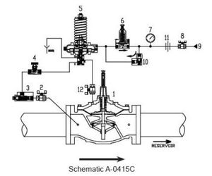 The 106-A-Type 4 and 206-A-Type 4 altitude control valves are based on the 106-PG or 206-PG main valve, and are ideal for maintaining a preset maximum water level. The valve functions as a two position control valve, either fully open or fully closed. The Type 4 allows normal forward flow to fill the reservoir to the maximum level, then closes drip-tight at the set-point. It opens to refill the tank once the level drops an adjustable amount below the high water level. Distribution from the reservoir is through a separate pipeline.