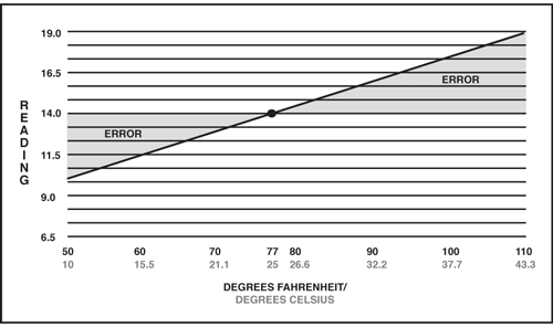 The graph below illustrates conductivity readings of a 14.0 millimhos dialysate sample tested with a non-temperature compensated conductivity meter. The same sample APPEARS to have a higher level of dialysate concentration when heated (and lower concentration when chilled). Actually, only conductivity readings change with temperature. Dialysate concentration does not change. Some instruments ignore the importance of temperature. Others require a separate thermometer for testing sample temperature then manual adjustment of the meter. All Myron L instruments, however, feature fast and precise Automatic Temperature Compensation. The result: a more accurate, useful instrument.