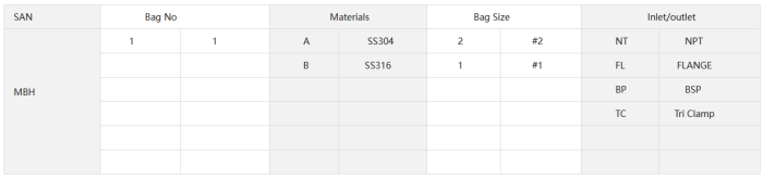 - Part No=MBH+Bag NO+materials+bag Size+inlet/outlet