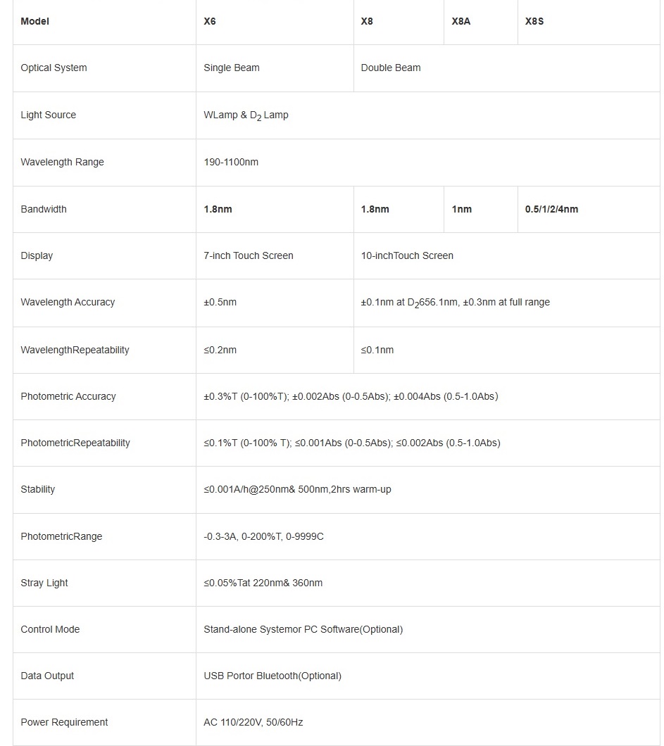 Large HD Smart Touch Screen. Stand-Alone System with Multi Functions. Automatic 8-position Cell Holder. Easy Printing. USB Port, Fast Data Output. Optional Bluetooth Module and PC software.. Large Sample Chamber, Multi Options of Accessories. High-quality Grating with High Performance. 16mm-thick Optical Base, Rigid Structure.