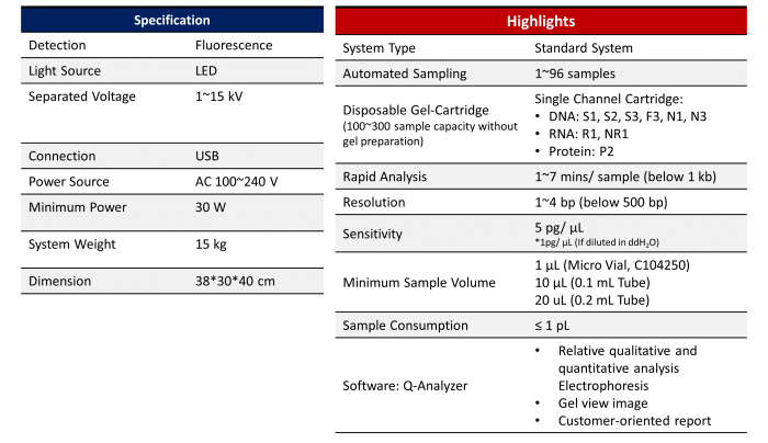 Qsep100 Bio-Fragment Analyzers is the most versatile instrument of the Qsep Series Bio-Fragment Analyzers. It provides consistent high precision analysis by using the same single-channel cartridge as the Qsep1. It provides flexible sample capacity from 1 to 96 samples. Qsep100 is commonly used in general research laboratories and also a good partner for the NGS QC laboratories. Moreover, with diverse cartridges, Qsep100 could apply to DNA, RNA, and protein analysis. It must be a powerful tool for Life Science, Agriculture, Pharmaceutical Industry, and Food Science research.