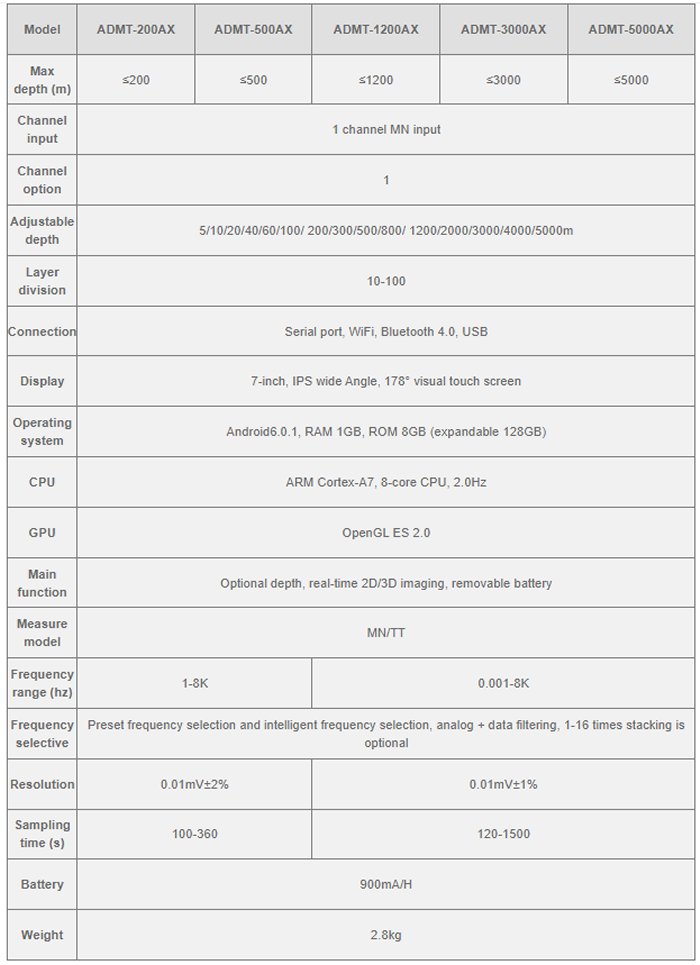 ADMT series products use the earth`s natural electromagnetic field as the working field source to study the electrical structure inside the earth. According to the principle that electromagnetic waves of different frequencies have different skin depths in the conductive medium, the earth`s electromagnetic response sequence from high frequency to low frequency is measured on the surface of the earth. , to study the difference in electrical changes of underground geological bodies at different depths, and to determine the occurrence state of underground geological bodies