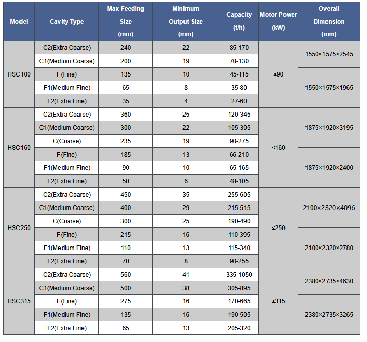 - Reasonable eccentricity and swing frequency as well as special crushing cavity design make the equipment with larger crushing ratio, higher capacity and better grain shape;