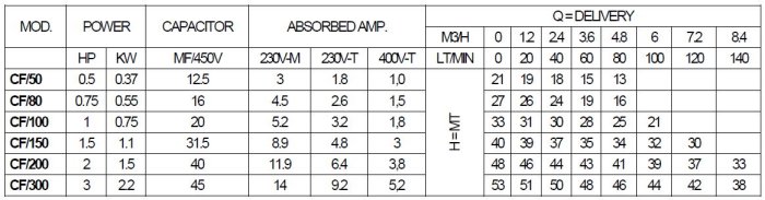 Cast iron monoblock centrifugal surface electric pumps with varied performances for clean water and similar liquids. Casing and bracket are made in cast iron, motor is in aluminium case, noryl-brass-cast iron impellers, standard mechanical seal in NBR/carbon/ceramic and shaft in quality s/s. Max water temperature 45°C tor pumps with plastic parts in touch with water and about 100°C for others. Suction 4/5 mt (8/9 mt for self-priming pumps). Induction 2 poles motor, continuative service, self-cooling protection IP44 and class F insulation. Single-phase mod. have a permanent split condenser and a thermo-amperometric protection. Standard voltages 230V-50 Cy (single-phase), 230/400V-50 Cy (threephase till 4 Kw) and 400/690V-50 Cy (three-phase over 5.5 Kw). Special voltages and executions on request.