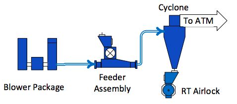 A positive displacement blower with silencers creates the air required for material transport. A feeder assembly is an airlock and allows introduction of material into the high pressure system. The high pressure piping has a thicker wall thickness than low pressure piping. Flatback elbows are used when making a direction change as the high pressure system uses fast velocities to transport material. The high pressure system can end at a target box, primary cyclone or primary filter. An airlock is located below the cyclone or filter as to not pressurize the object below the airlock. All air is discharged to atmosphere with a cyclone or filter.
