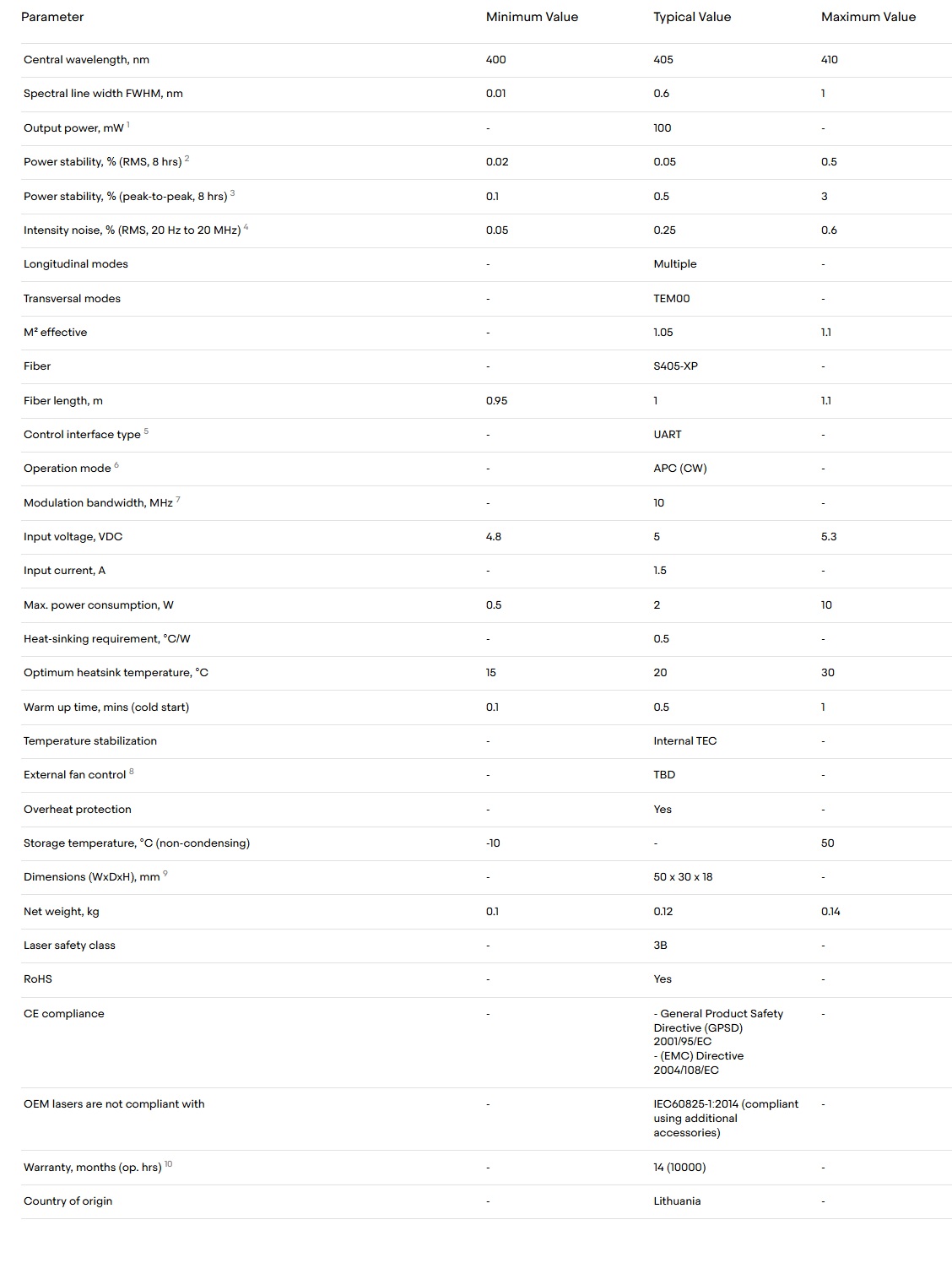 Single-mode fiber-coupled 405 nm laser diode in the compact and robust MatchBox platform. Proprietary fiber coupling technology offers alignment-free operation throughout the lifetime of the laser. Single-mode fiber ensures ideal beam quality and focusability, thus making this laser the best choice for high-resolution fluorescence imaging or 3D lithography applications. Proprietary fiber coupling technology ensures good power stability and excellent fiber-coupling efficiency.