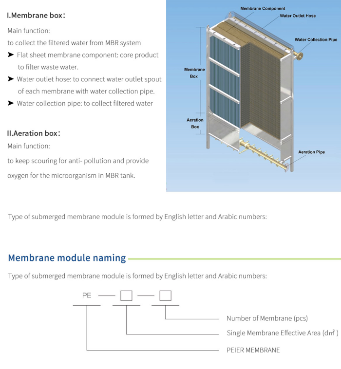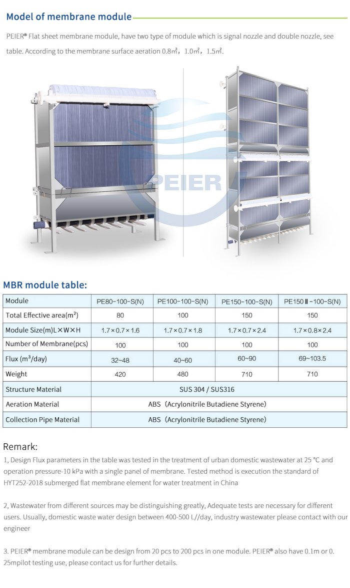 PEIER® Flat sheet membrane module, have two type of module which is signal nozzle and double nozzle, see table. According to the membrane surface aeration 0.8m, 1.0m, 1.5m.