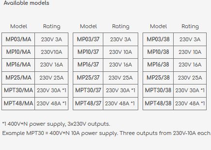 Up to a total load of 25A, the supply is 230V single phase (MP models). Above this load, it is 400V three phase + neutral (MPT models).