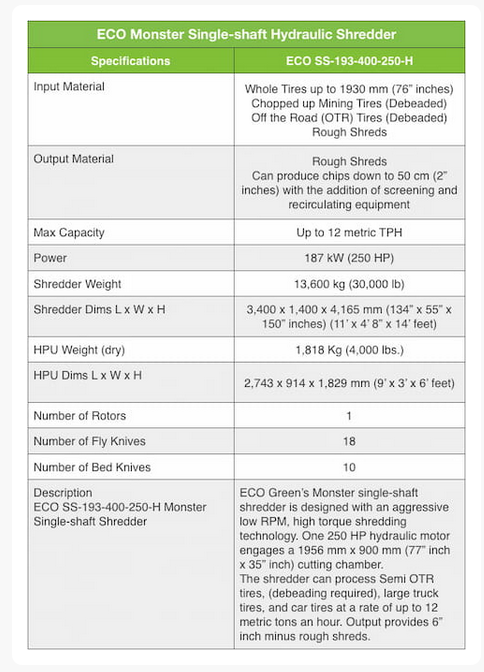 - The ECO Monster can shred Semi OTR tires, large truck tires and car tires…up to 12 metric tons/hour.