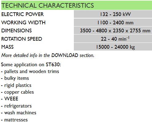 ST630 are sturdy pre-crushers with high performance and capacity. These machines can handle a wide range of materials that must not be contaminated by heavy metals or materials that cannot be grinded. This single shaft is designed for bulky items crushing and it represents the first phase in the RDF or similar plants. The sorting grid can be automatically extracted by an hydraulic system: shock detector and level sensors into the hopper complete the machine configuration.