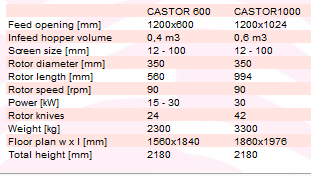 CASTOR is single shaft shredder designated for shredding of cables, wood, plastics, paper, textile, rubber and similar materials to the grain size from 12 mm. The screen located in bottom of the shredder defines the size of the shredded material. The machine can shred material with mixture of minerals and steel in the form of nails, sheets and the like. CASTOR is equipped with pushing system. Pusher periodically pushes shredded material to the rotor. Control system checks the rotor loading, at the shredder overloading the pushing is interrupted and system keeps the shredder on smooth running.