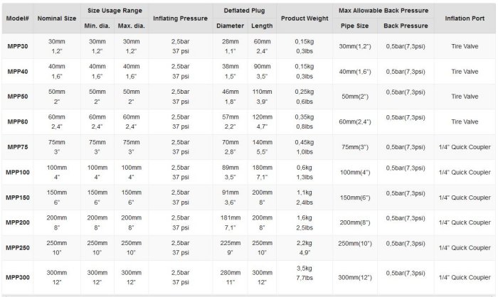 MPP models can use any sizes between 30 mm up to 300 mm diameter with 2,5 bar inflation bar. For plugs 30 mm up to 60 mm diameter, tire valve is used. For plugs 75 mm up to 300 mm diameter, ¼” quick coupler is used. MPP use just single size, not multiple size. They are smaller than multi size models and cheaper than multi size models.