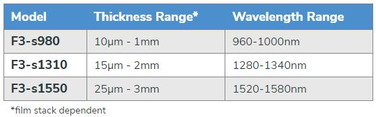 The F3-sX family uses near-infrared (NIR) light to measure layer thickness - even many layers that are opaque to the eye (such as semiconductors). The 980 nm wavelength version, the F3-s980, is designed for cost-sensitive applications. The F3-s1310 is optimized for measuring heavy-doped-silicon, while the F3-s1550 is intended for the thickest of layers.