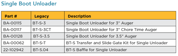 - Single out unloader for 3.5” auger (baffle not included, comes with door and wingnuts)