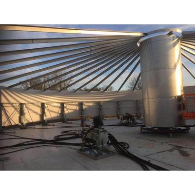 A number of containers of material and machinery are transported to the location, together with the team (which includes welders). Once at the location, we set up our proprietary coil building system on site as the basis for the tank construction. Our machinery unrolls a stainless steel sheet for one hull section, cuts it to size and then welds it automatically. Once the first layer of the tank is complete, computer-guided hydraulic lifts raise the hull section so that the next section can be inserted in the same way. The tank is constructed step by step from the bottom. All work is carried out efficiently and at workable height.