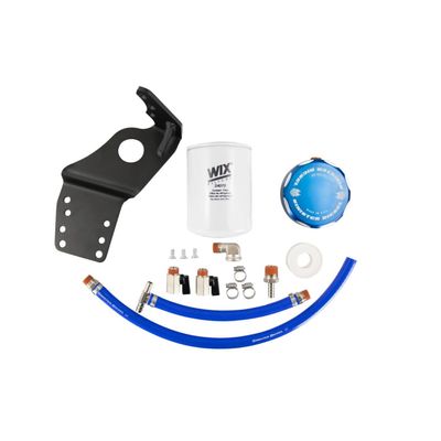 The filter boss is constructed of CNC machined billet 6061 aluminum, and it is anodized with a Sinister Blue finish helping to combat corrosion and adding a great look under the hood. This kit includes everything required for installation including the bracket, fittings and WIX coolant filter; no drilling or modifications are required. The filter can be easily unscrewed for replacement. We recommend replacement of the first filter at 500 miles with replacement of the second and third filters is at 3,000 miles each. After 3 changes, filter replacement can be done once a year. The silicone hoses fittings are pre-assembled for simple, leak-proof connections that factory tested at twice the recommended radiator cap pressure. Depending on experience, installation time should take around 2 hours. Recommended Tools: 9/16”, 13/16” wrench, 8mm socket, 3/8” 12 point socket or 5/16” combination wrench, large adjustable wrench, regular screwdriver, utility knife and diagonal cutters.