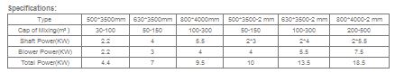 Paddle powder mixer supplier in China customized pug mill for bulk dry powder in cement production, max capacity 200-500 M3/H, 500x3500MM to 800x4000MM.