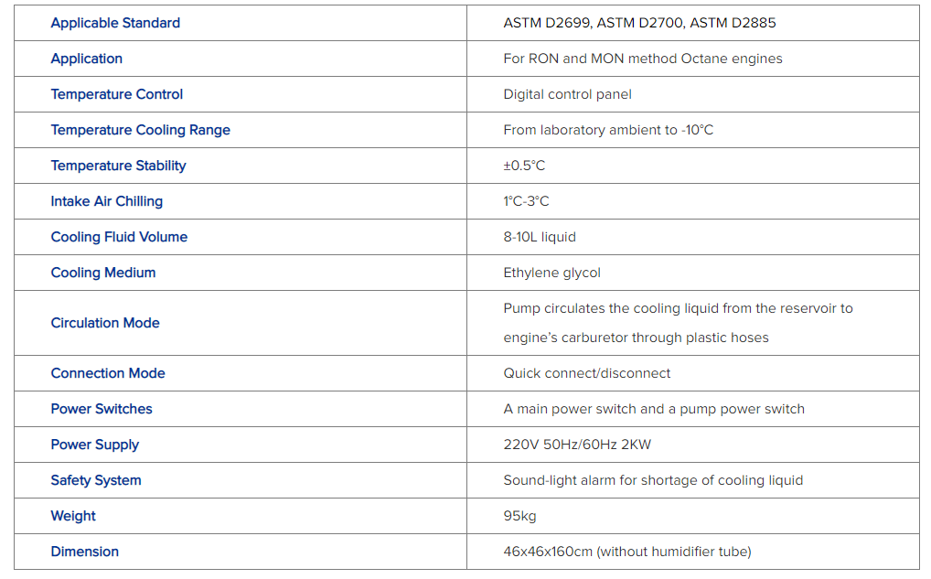Intake Air Humidity Unit for CFR test engines is equipped with an adjustable refrigeration system replacing the ice tower previously used for chilling and dehumidifying intake air to research and motor method octane test engines. This unit is connected through the humidifier tube to the carburetor for regulating the moisture content of intake air into octane engine at a constant 25-50 grains of moisture prescribed of dry air as specified by ASTM D2699, ASTM D2700, ASTM D2885. Please visit our website: www.sh-sinpar.com for more details.