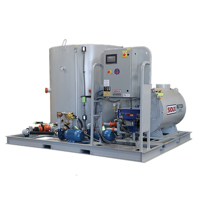 If you need a larger water tank, Sioux offers the NextGen HWP with a 1MBTU/Hr WH Series water heater and a 1,000 gallon atmospherically vented water tank. A single stage centrifugal pump with a 3-HP motor is included for circulation through the heat exchanger and a single stage centrifugal pump with a 7.5-HP motor capable of 180 GPM @ 90 ft of head for the discharge pump. Connect the inlet and outlet water, plus utilities, and you are ready to make hot water.