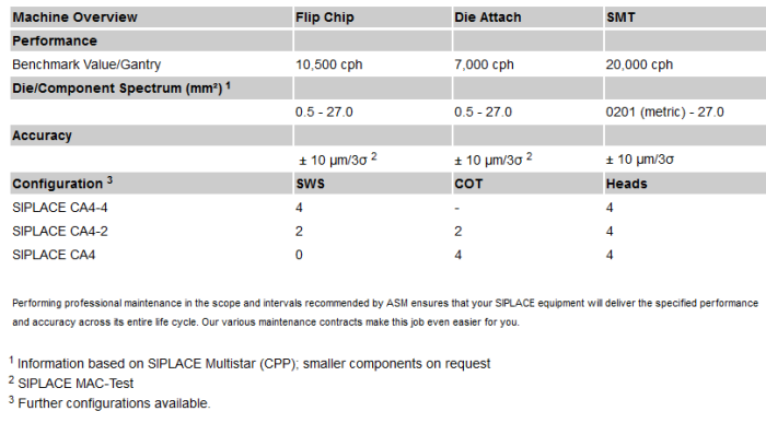 The SIPLACE CA places up to 42.000 flip-chips or attaches up to 28.000 dies per hour with four of its SIPLACE SpeedStar heads. The components are supplied via special SIPLACE wafer systems (SWS) directly from wafers with diameters ranging from 4 to 12 inches. A Flip-Chip Unit (FCU), Die-Attach Unit (DAU) and Linear Dipping Unit (LDU) complete the equipment of the SIPLACE CA for flexible and highly accurate bare-die placement applications (+/ - 10 µm @ 3σ with embedded Wafer Level Ball Grid Array (eWLB) - Option).
