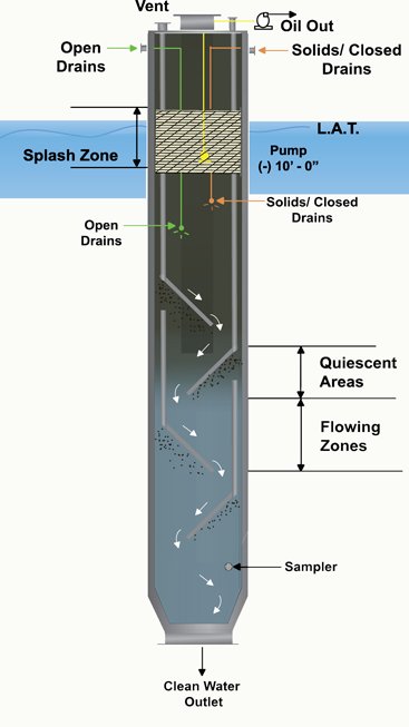 Free oil is removed from sand due to the agitation and abrasion created as the sand tumbles down the series of baffle plates and is disposed of through the end of the caisson. The Sumperator (Skim Pile) is the final stage of the open drain and/or produced water treatment system and is guaranteed to remove all oil globules greater than 50 microns.