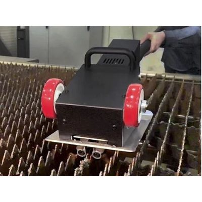 The tool is moved along the slats on the bed of a laser machine to remove slag that accumulates while cutting. Rotary cutting tools ride on each side of the slat to lift and remove the slag. It may be used on steel, copper or hybrid steel/copper slats. When not in use it may be rolled along the floor and stored in the upright position.