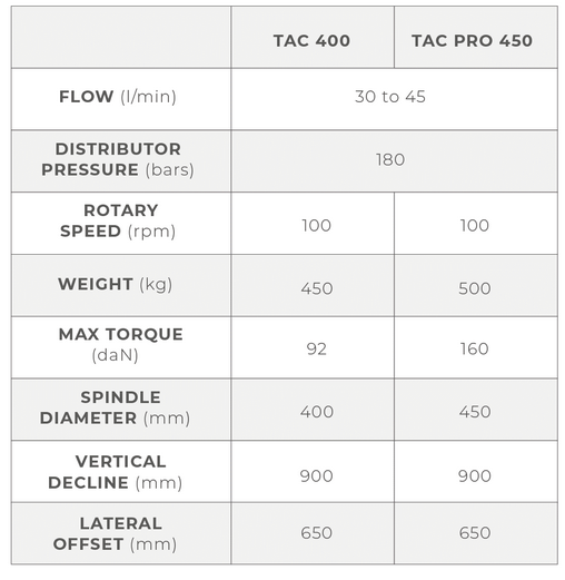 A hydraulic motor in the TAC version or a hydraulic motor combined with a gear motor in the TAC PRO version directly drives the spindle’s rotation.