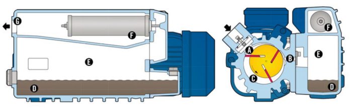 Operating principle: The MAPRO® vacuum pumps, BV series, are rotary vane machines, oil recirculating type. In these vacuum pumps a cylindrical rotor turns eccentrically in a cylindrical stator of a larger diameter: the free space left between stator and rotor is half-moon shaped. Three slots are milled in the rotor and stratified plastic blades slide freely into the slots. The blades, as the rotor turns, are forced out against the cylindrical wall of the stator by centrifugal force, so creating individual “cells” whose volume changes continuously during the rotation.