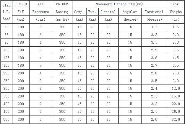 Rubber: EPDM, Natural Rubber, Neoprene, Nitrile, Hapylon, etc. Clamp: 304ss. Bolts & Nuts: 304ss. Design Pressure: 6 Barg. Applicable Temperature: -20? to 80?.