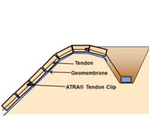 Using tendons and ATRA tendon clips, support a GEOWEB solution over liners without puncturing the impermeable liner with stakes.