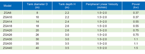 ZGA sludge scraper consists of working bridge (normally, half-bridge) , drive mechanism, rotary frame, scraping arm and scum board, dragline, hopper agitating impeller, steady flow cylinder, electric cabinet. According to the actual condition, we can add effluent weir plate, skimming mechanism, slag tap and sludge hopper,etc.