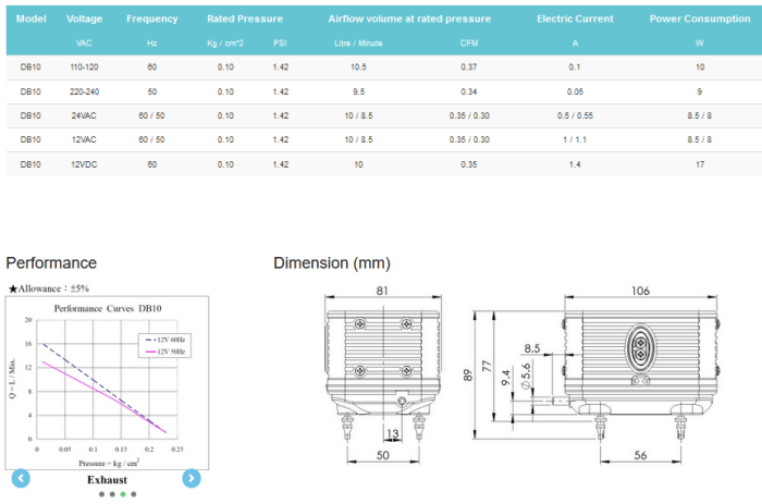 Max Pressure:0.220 Kg/cm2 (3.12PSI). Max Airflow volume:15 Liter per minute (0.53CFM). Noise level 40 dBA @ 0.10 Kg/cm2. Extremely silent, Energy saving, Oil-free, easy maintenance.