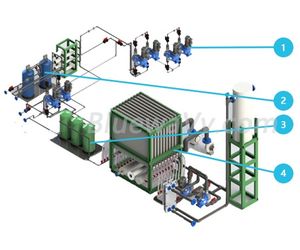 The complete diaphragm electrolysis chlorine production system has many derivative systems, the main products are chlorine and sodium hydroxide which can be derived to produce basic chemical agents and pharmaceutical intermediates such as HCI. NaOH. NaCIO. NaCIO2. NaCIO3 M-CHLOR provides a safe, efficient and reliable system that enables manufacturers, distributors and consumers of chlorine-containing disinfectants and household chemicals to economically and efficiently produce high-quality self-made sodium hypochlorite (bleach), Or chemicals such as hydrochloric acid and caustic soda for internal use on site, or for distribution and sales.