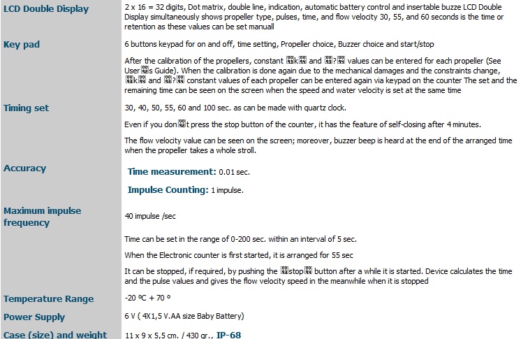 Small Current Meter is used worldwide for its proved quality, precision and reliability in measuring low water level. It is especially recommended for measurements in remote regions whenever a lightweight and handy measuring instrument is required. Small Current Meter provides solutions for all velocity measuring applications. The highly precise, reinforced spindle bearing as well as an on- contact signaling system give the possibility for measuring flow velocities as from 0,025 m /sec. up to 5 m /sec. Low starting speed of 0.025 m/sec. Minimum depth of water for using this instrument is approx. 4 cm. Small Current Meters set the standard for liquid-flow measurement and without them hydrometry is not imaginable.
