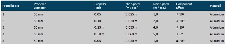 Depending on the pitch of the propellers used, different velocity ranges may be obtained. Besides, the propeller has a component effect. The angular degrees specified in the table show the extent of oblique flow up to which the propeller measures the true velocity value.