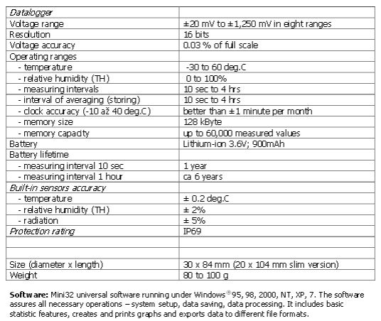 Minikins are small dataloggers with built-in sensors for the measurement of environmental variables. They are intended for long-term monitoring. The measuring accuracy, memory size and the overall design overruns most of the similar products. The datalogger case is watertight, made from stainless steel and high-density polyethylene. The humidity sensor has sintered stainless steel filter to protect it against splashing. The non-volatile data memory can store typically 60,000 measured values what is enough for more than two years of storing of three measured variables in hourly intervals. According to measuring mode, the oldest data in the memory can be overwritten with the newest ones or the measurement stops when the memory is full.