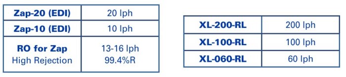 Zapwater EDI modules were developed as electrodeionization for small countertop or wall-mount laboratory water systems. Zapwater RO-EDI systems can be designed to produce ASTM Type I & II, or JIS A2 to A4 lab water. 17 Megohm typical water quality if the RO and pretreatment are optimized.